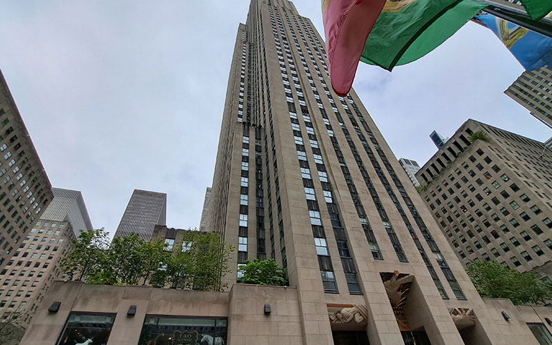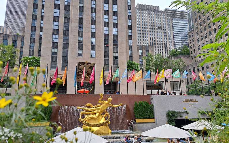 El complex del Rockefeller Center està format per diversos edificis ubicats en diversos blocs dedicats a oficines que ocupa gairebé 9 hectàrees. Podríem fer una entrada especial només d’aquest edifici, però per no fer-ho llarg i quedar-nos a la part més turística, dins hi ha la botiga de la NBC (la cadena de televisió de Friends, tot i que hi ha molt poc merchandising), la plaça principal de les banderes on a Nadal hi ha el famós arbres de Nadal i la pista de gel, els Channel Gardens i les botigues de l’envolten, com per exemple la Tiffany & Company i en especial la FAO Schwarz una botiga de joguets increïble!.