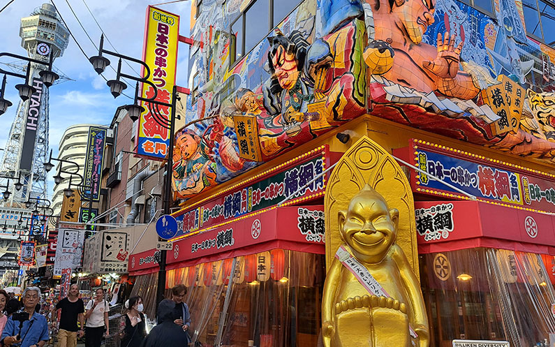La zona pròxima al canal Dotonbori és un lloc caòtic, amb més gent, més botigues, més llums i més serolls. Pantalles de tele que anuncien les mil i una meravelles, turistes fent-se fotos al famòs cartell de Glico Running Man o el gegant cranc de Kani Doraku i japonesos gaudint de la tarda després d’un dia de feina. Aquí hi ha ambient sempre, però al vespres és un dels moments àlgids.